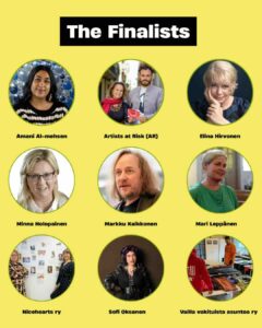 Amani Al-mehsen, Artists at Risk (AR), Elina Hirvonen, Minna Holopainen, Markku Kaikkonen, Mari Leppänen, Nicehearts ry, Sofi Oksanen, and Vailla vakituista asuntoa ry. We congratulate all the nominees for their valuable work!