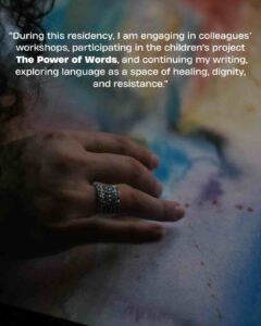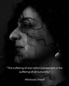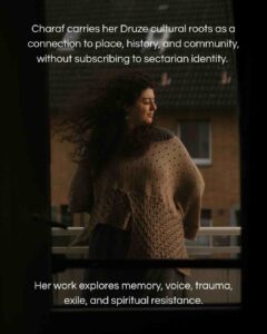Charaf draws on her Druze roots as a connection to place, history, and community, without following a sectarian identity. Her work explores memory, trauma, exile, and resistance. She has held international residencies, including ICORN (Poland), PEN (Germany), and the IIE Artist Protection Fund (USA), and is currently based in Graz.