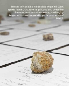 Rooted in his Ngiba Indigenous origin and worldview, his work spans community arts, research, and collective forms of writing and testimony, challenging hegemonic and imperial narratives.