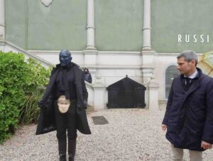 Ukrainian actor Aleksey Yudnikov during his protest performance in front of the empty Russian Pavilion at the Venice Biennale in 2022. (photo via Artists at Risk)