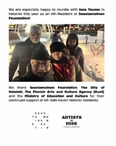 We thank Saastamoinen Foundation, The City of Helsinki, The Finnish Arts and Culture Agency (Kuvi), and the Ministry of Education and Culture for their continued support of AR-Safe Haven Helsinki residents.