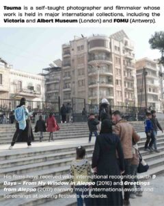 Touma is a self-taught photographer and filmmaker whose work is held in major international collections, including the Victoria and Albert Museum (London) and FOMU (Antwerp). His films have received wide international recognition, with 9 Days – From My Window in Aleppo (2016) and Greetings from Aleppo (2017) earning major international awards and screenings at leading festivals worldwide.