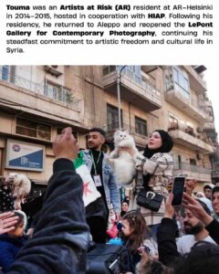 Touma was an Artists at Risk (AR) resident at AR–Helsinki in 2014–2015. Following his residency, he returned to Aleppo and reopened the LePont Gallery for Contemporary Photography, continuing his steadfast commitment to artistic freedom and cultural life in Syria.