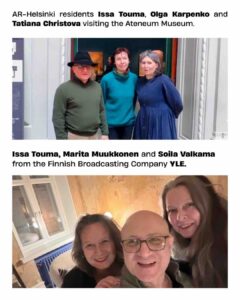 During this residency in Finland, Touma engaged actively with the AR community and partners: visiting AR–Porvoo; joining fellow AR–Helsinki residents Olga Karpenko and Tatiana Christova at the Ateneum; celebrating the opening festivities of the DocPoint Documentary Film Festival with Soila Valkama from YLE among others and meeting with key cultural and institutional actors such as the Finnish Film Foundation and AVEK Audiovisual Centre.