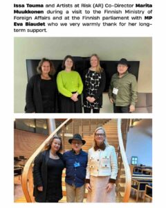Together with AR Co-Director Marita Muukkonen, he visited the Finnish Ministry of Foreign Affairs and the Parliament of Finland, where they met with MP Eva Biaudet.