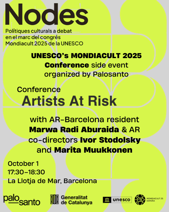 AR-Barcelona resident Marwa Abu Raida and co-directors Marita Muukkonen and Ivor Stodolsky at Nodes Barcelona panel at MONDIACULT 2025 today